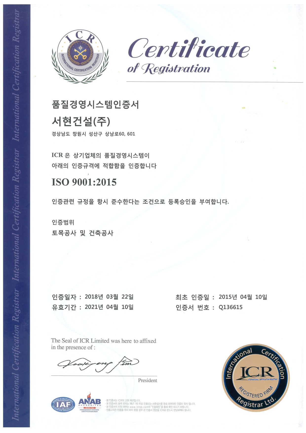 ISO 품질경영시스템 인증서