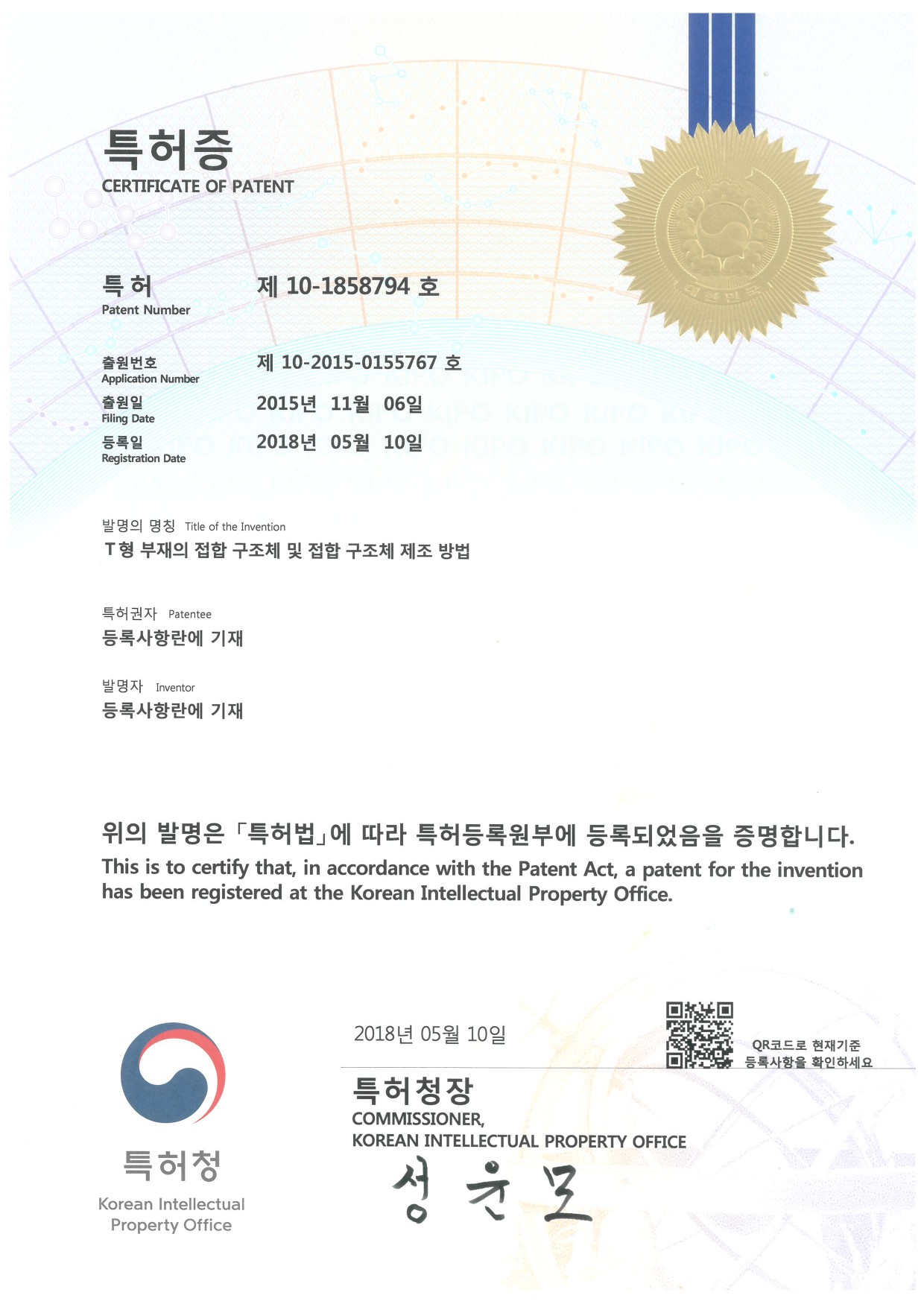 특허증 제 10-1858794호