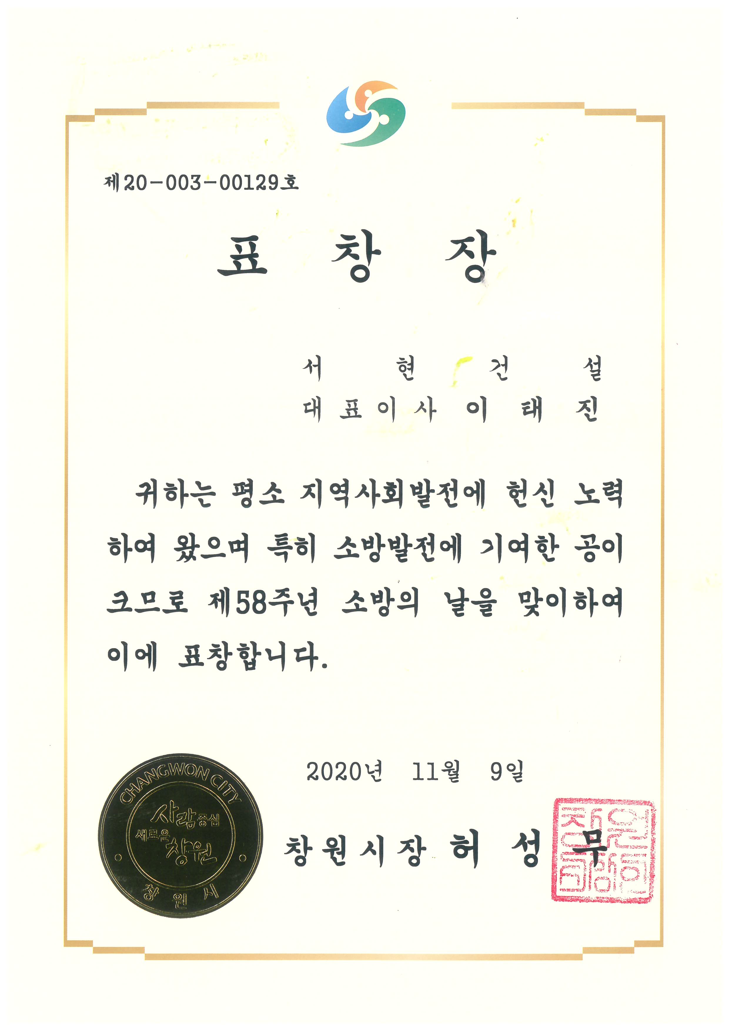 소방의 날 창원시장 표창장 수여
